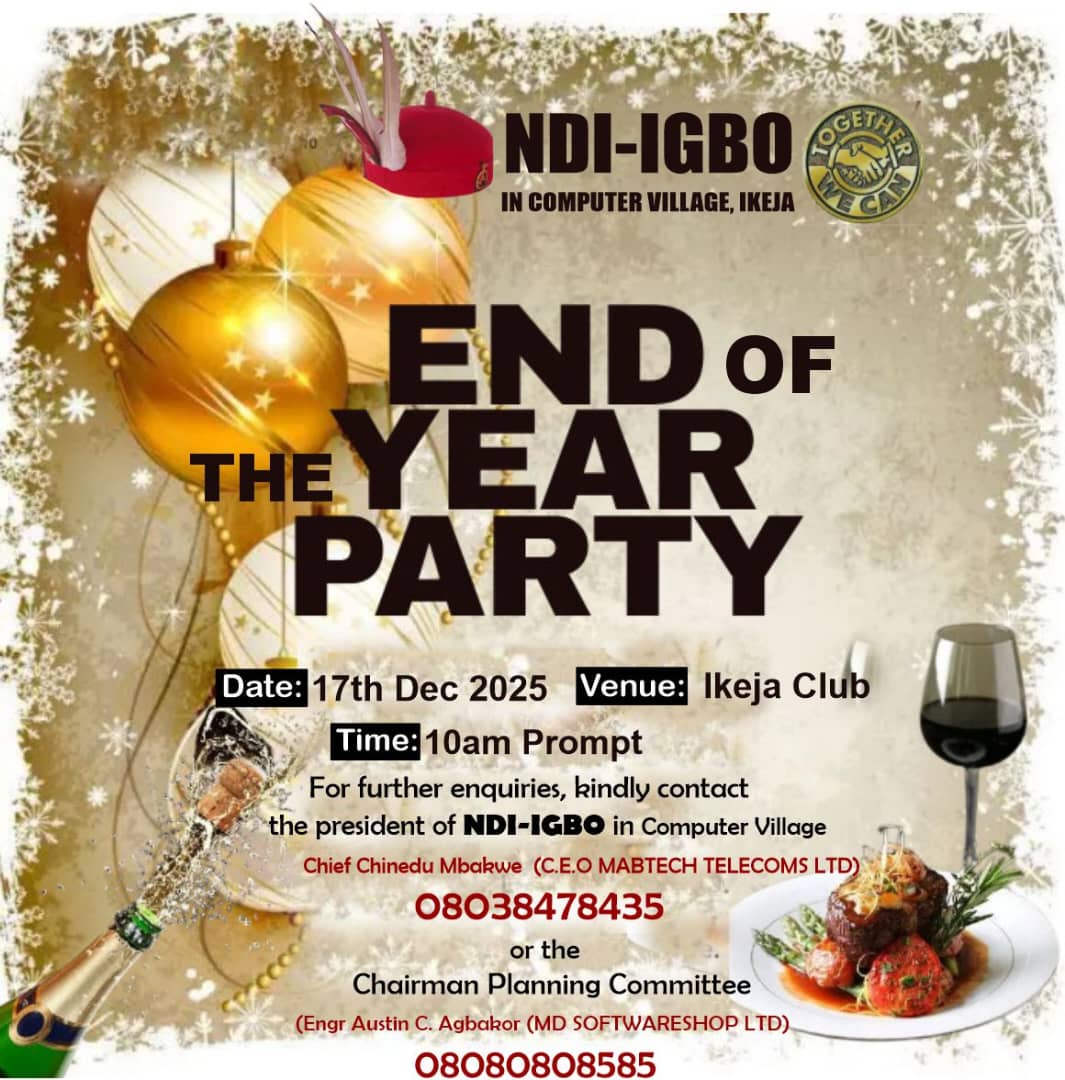 IT’S GOING TO BE A BANG! Ndigbo in Computer Village, Ikeja END OF YEAR 2025 Party. It’s that time of the year again where people gather to celebrate and thank God for a fruitful year. As we approach the end of the year, we would like to invite you to our End of Year Party, […]